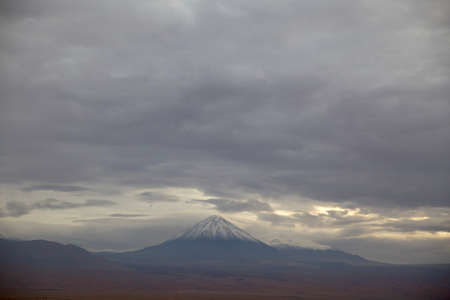 volcano with snow on the peak under a dramatic sky and sunbeams sneaking through the clouds. Licancabur, San Pedro de Atacama, Chile