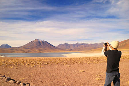 Visitor shooting photos of Miscanti lake with Mt. Cerro Miscanti in the backdrop, highland of Antofagasta region, northern Chile