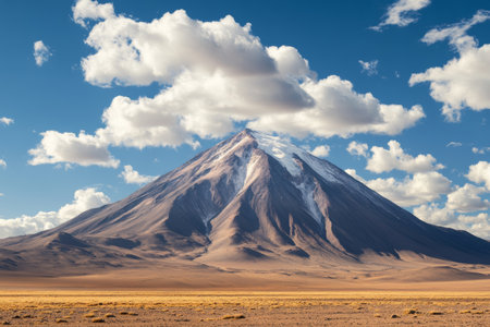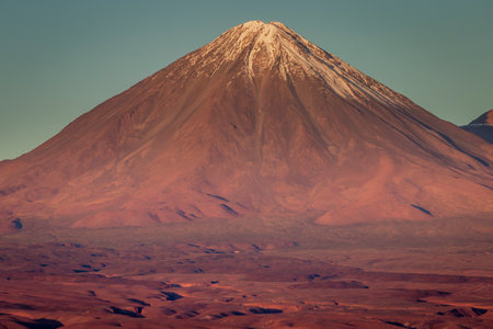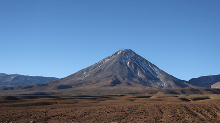 Stratovolcano Licancabur with its characteristic snow peak in Atacama Desert, Chile. The volcano is a part of the Andean Volcanic zone with characteristic cone profile.