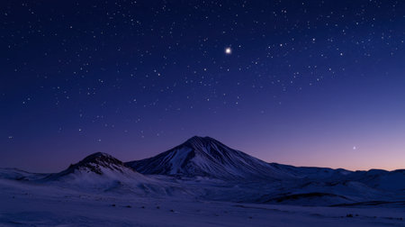 A breathtaking view of a snow-covered mountain under a starry night sky. The serene atmosphere captures the beauty of nature and winter's tranquility.