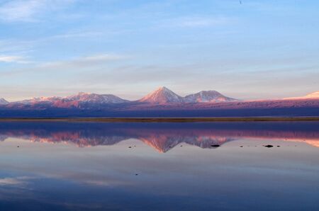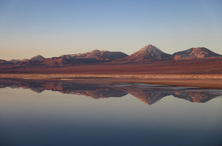 Volcanic landscape and salt lake reflection at sunset in Atacama Desert, Chile