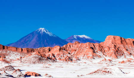 View on Volcanoes Licancabur and Juriques, Moon Valley, Atacama desert, Chile