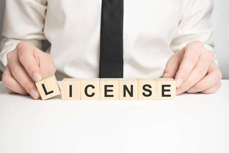 Business person presses his finger on the wooden cubes with the word license. Copyright protection law license property rights.