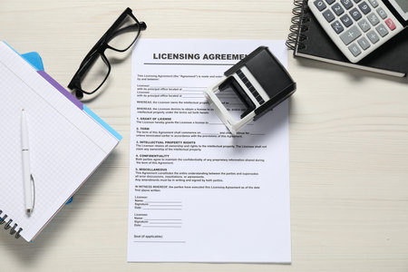 Licensing agreement document and stamp on wooden table, above view