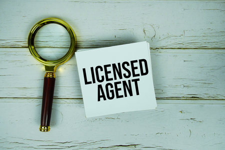 Licensed Agent text message on sticky note with magnifying glass on wooden background