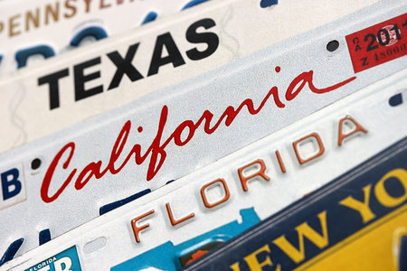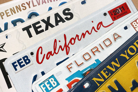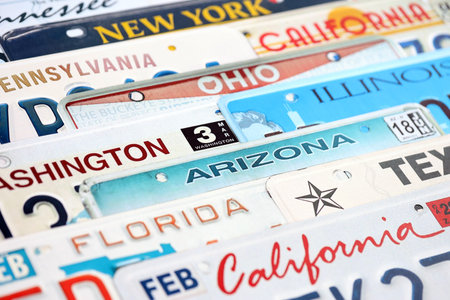 Old US car license plates with various state names. Concept of driving in United States. Reaching a car registration
