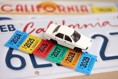 KYIV, UKRAINE - OCTOBER 1, 2025 California car registration tag stickers for various years on license plate close up