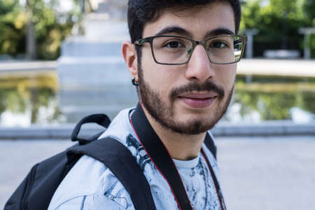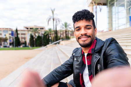 selfie of a young latin man smiling happily in a city park, concept of technology and urban lifestyle