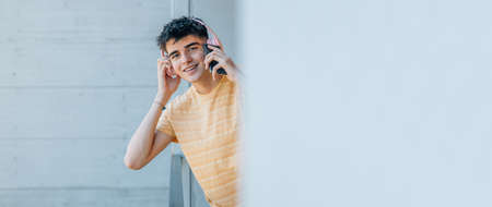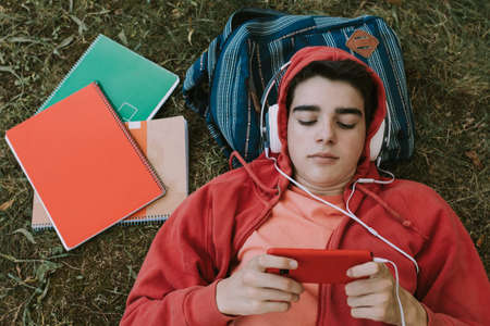 Portrait of a latin teenage boy sitting on the grass wearing glasses and earphones.