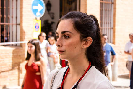 Madrid, Spain - Sep 11, 2021: A woman, working to recruit partners for an NGO near the 80th Madrid book fair