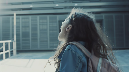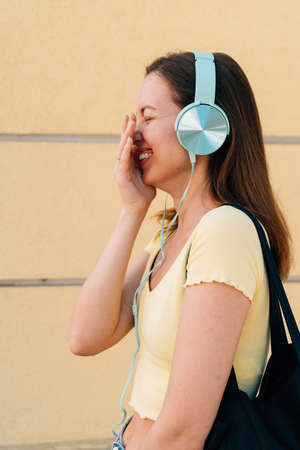 photo of teenage girl on a turquoise wall background. Teenager girl in orange jacket. portrait,