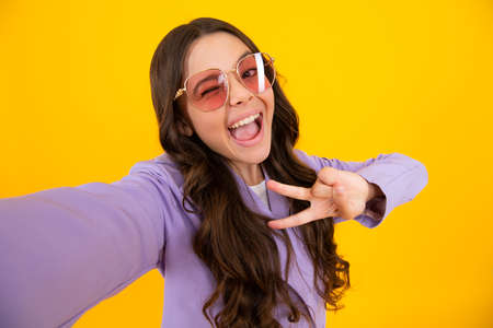 Asian girl with piercing gesturing while taking selfie photo isolated over yellow wall