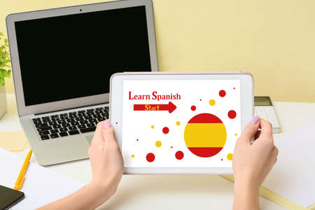 Woman holding tablet computer with text LEARN SPANISH on screen at workplace
