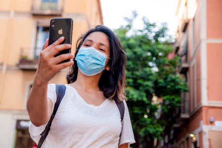 young tourist woman taking selfie with face mask, example of tourism industry at the time of covid19. symbol of summer holidays at the time of corona virus