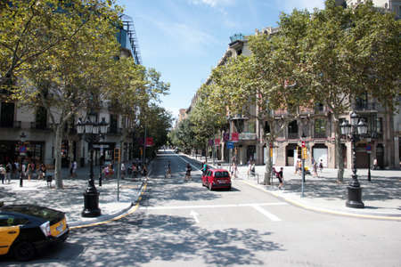 BARCELONA,SPAIN - JUL 19, 2018: La Rambla street. La Rambla is a street in central Barcelona, popular with tourists and locals alike.