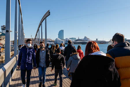 Barcelona (Catalonia, Spain) - January 6, 2022: Tourists wearing protective face masks walk along the Rambla de Mar bridge in Barcelona during the coronavirus pandemic.