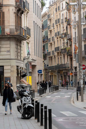 Barcelona, Catalonia: 2021 April 6: People walk in the streets of the El Raval neighborhood in the city of Barcelona in time of COVID 19 in 2021.