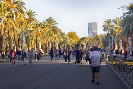 Barcelona, Spain - October 9, 2017: boardwalk, promenade, street, bridge, palm trees, hotels, tourists, citizens. Mediterranean resort and tourist center