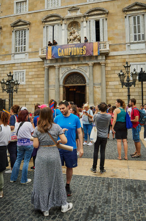 Barcelona - June 08, 2023: Barcelona football club champions of the Spanish womens soccer league on the balcony of the town hall.