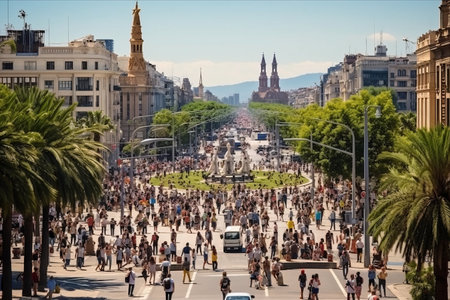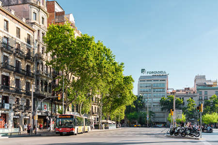 BARCELONA, SPAIN - JUNE 06, 2019: People and tourists walking on one of the most important avenues in downtown Barcelona city