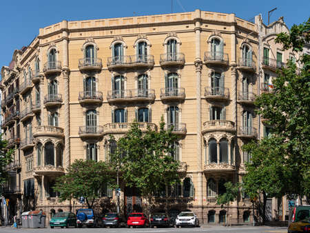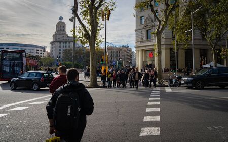 BARCELONA, SPAIN - FEBRUARY 24, 2019: View on the street in downtown in Barcelona, Spain. Barcelona famous for its architecture