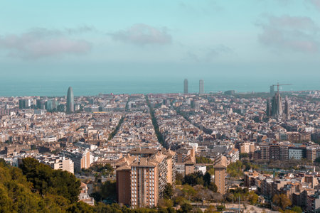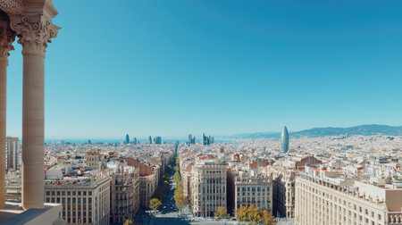 A stunning panoramic view of Barcelona showcasing the vibrant skyline, modern architecture, and clear blue sky. Ideal for travel and cityscape enthusiasts.