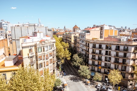 Barcelona Spain, high angle view city skyline at La Rambla street
