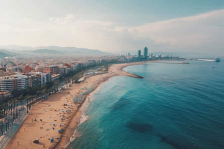 This vibrant beach in Barcelona showcases golden sands dotted with colorful umbrellas under a bright sun, while the city skyline contrasts the beautiful blue waters.