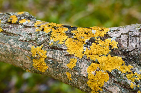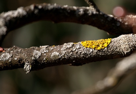 Yellow lichen on the tree branch