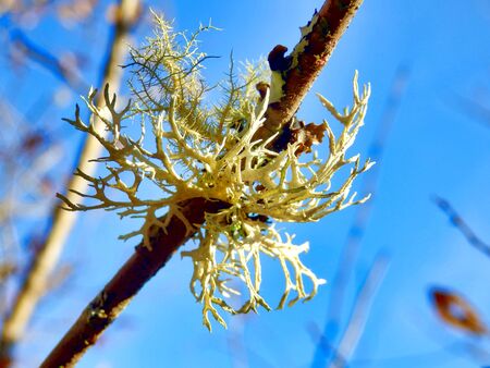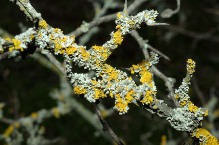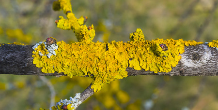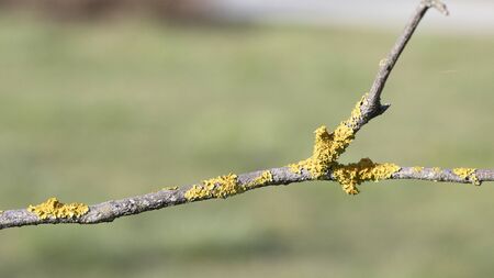 the common yellow lichen on a thin branch in the sunlight