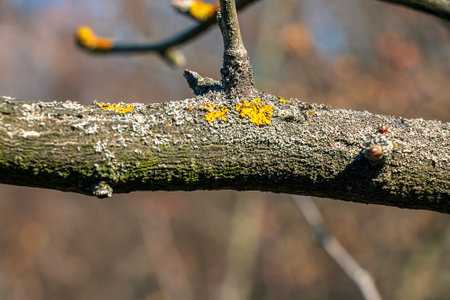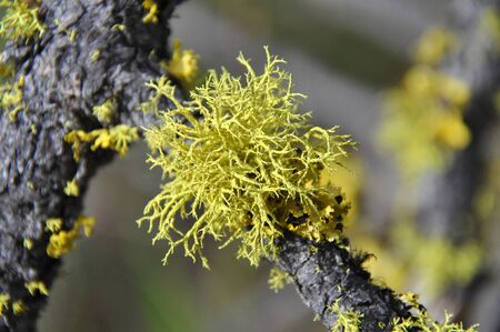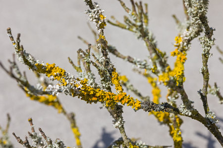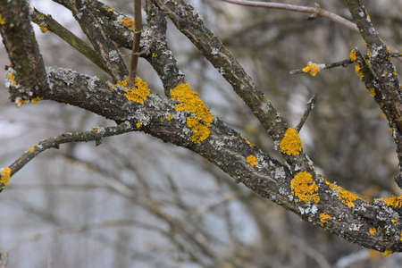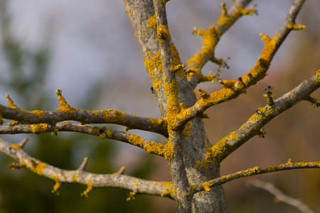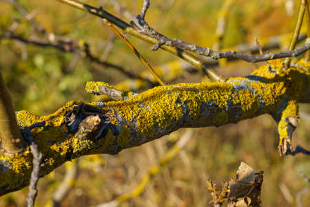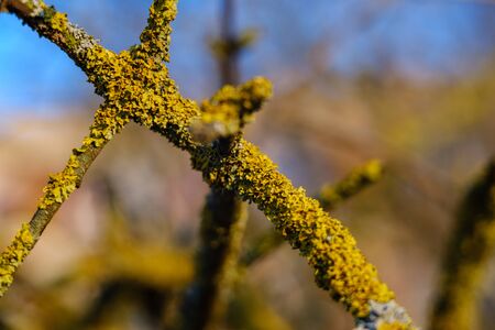 Yellow lichen on a tree branch close-up. Moss on the branches in the day. Selective focus.