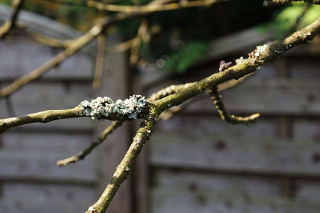 Light green lichens on a fruit tree branch