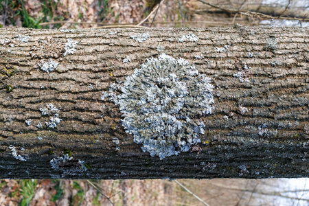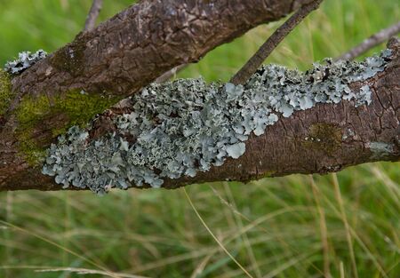 A close up of lichen Hypogymnia physodes on an old tree branch.