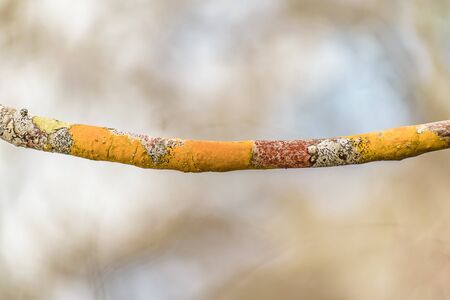 Xanthoria parietina, common orange lichen, yellow scale, maritime sunburst lichen and shore lichen, on the bark of tree branch. Thin dry branch with orange lichen, close-up, on blurred background.