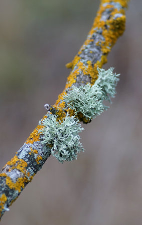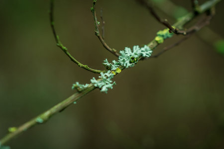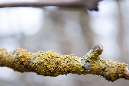 Detail of lichen on a twig of the tree with a blurred background
