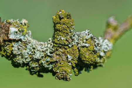 Green lichen close-up on tree branch. Plant disease.