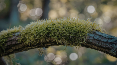 A close-up view of a tree branch covered in vibrant green moss, set against a blurred forest background with bokeh lights.