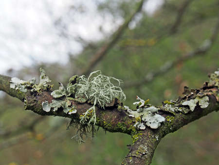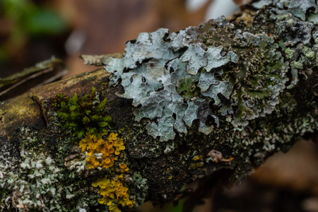 close up of different lichens growing on a forest tree branch in winter in the UK