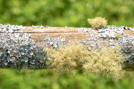 Moss and lichen growing on a wooden fence in the countryside