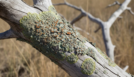 Close-up view of colorful lichen growing on weathered wood, showing the intricate patterns and textures of this symbiotic organism in a natural setting