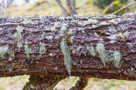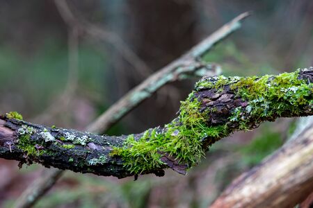 Moss on a branch in the forest. Branches of trees in the forest in late autumn. Autumn season.