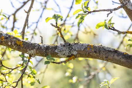 Gray and yellow lichen on the bark of an apple tree fruit tree