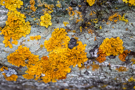 Macro photo of beautiful yellow lichen covering gray granite