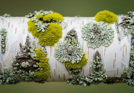 lichen on a branch with dark green mosses, lichen growing on board. Abstract organic photo.