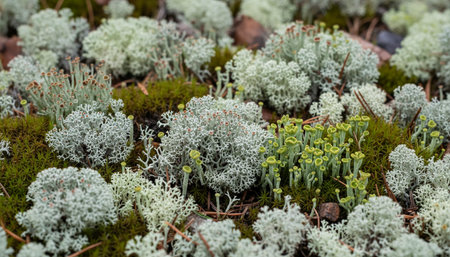 Cup lichen on the forest floor. Pine needles and moss. Macro shot from botany. Nature in the forest
