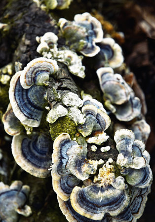 Multi-colored tree mushrooms on an old tree trunk close-up.