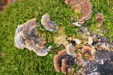Colorful mushrooms on tree bark in a vibrant forest enhance the beauty of this habitat