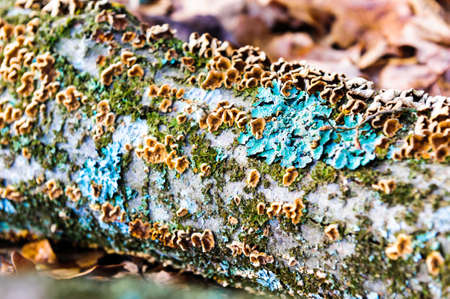 lichen on a branch with dark green mosses, lichen growing on board. Abstract organic photo.