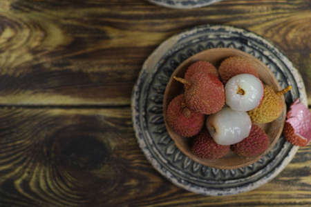 Litchi is placed in a wooden plate, peeled or unopened, on a dark wood grain table