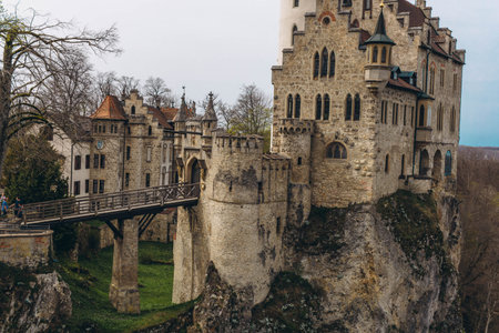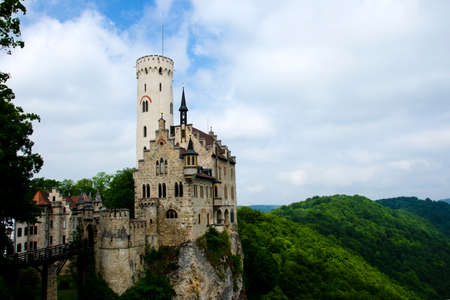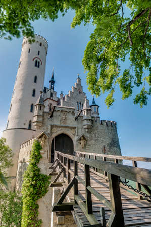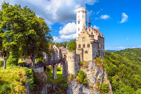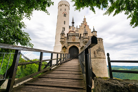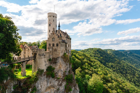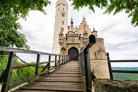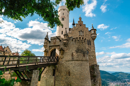 Lichtenstein Castle with high bridge, Germany. This scenic castle is a landmark of Germany. Beautiful view of fairytale Lichtenstein Castle on a cliff. Nice landscape of Swabian Alps in summer.